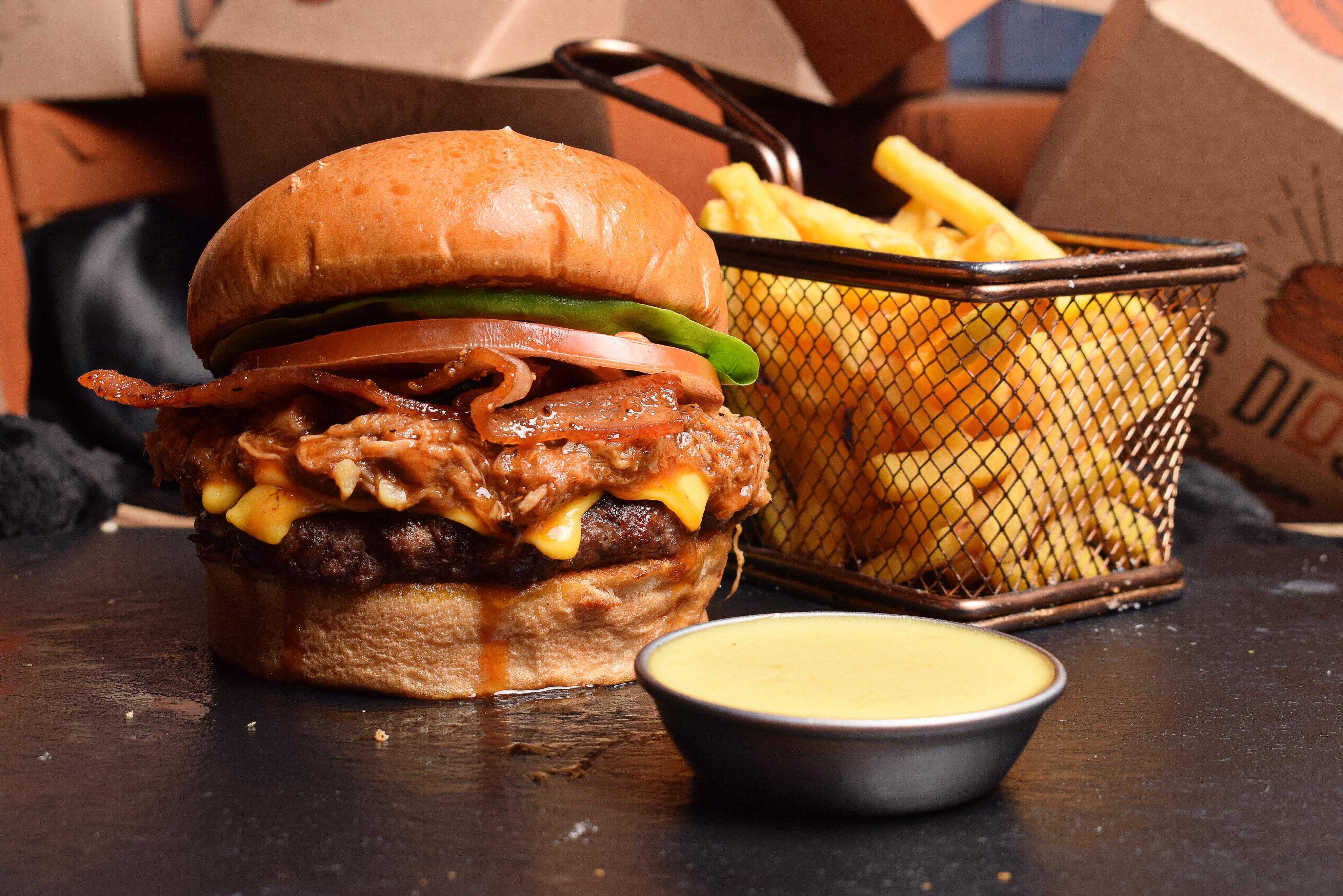Pan tipo brioche, carne artesanal tipo Brangus, costilla de cerdo desmechado en reducción de cerveza negra, queso cheedar, tocino ahumado, terminada con vegetales frescos (tomate y lechuga) salsa BBQ Jack Daniel´s y salsa de la casa. Acompañado de papas a la francesa.
