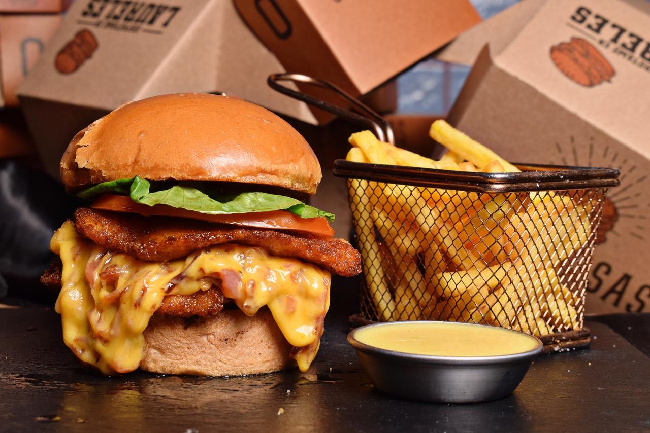Combo personal: Pechuga de pollo apanado, pan con brioche, fondue de queso cheddar y tocino ahumado, terminada con vegetales frescos, salsa de la casa. Acompañada de papas a la francesa.