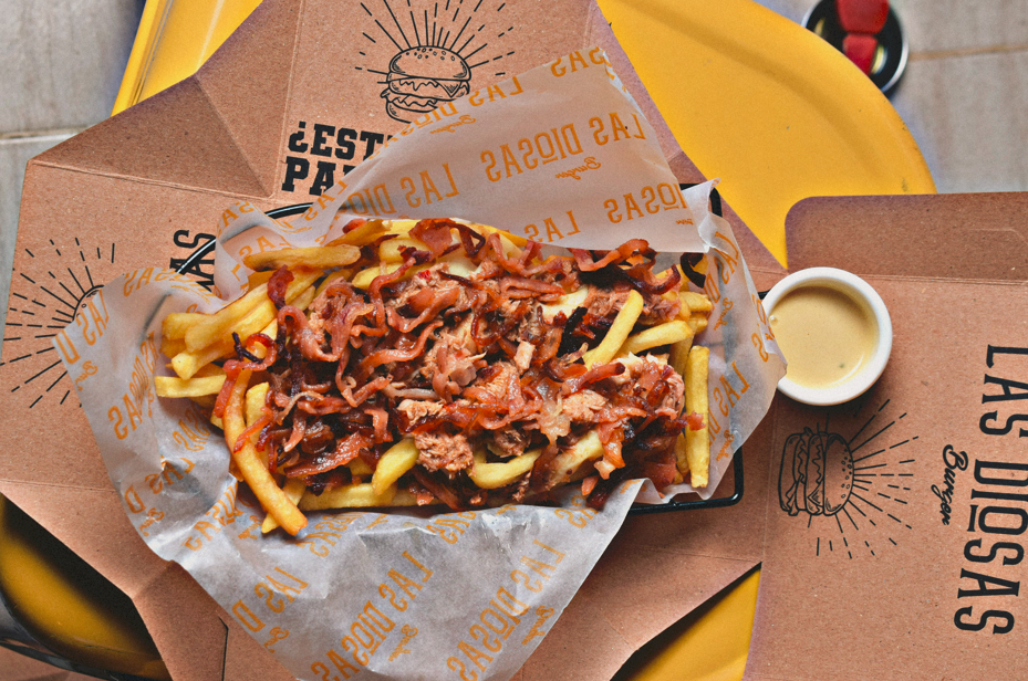 Deliciosas papas a la francesa, con trozos de pollo crispy perfectamente apanados, queso cheddar, tocino ahumado, terminadas en nuestra deliciosa salsa las diosas de la casa.