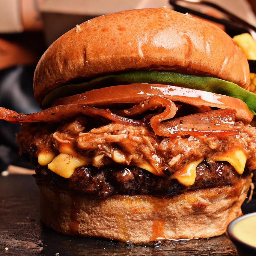 1 Hamburguesa CON PAPAS a eleccion (Carne tipo Brangus, pan brioche, queso cheddar,costilla de cerdo desmechada en reducción de cerveza negra, tocino ahumado,terminada con vegetales frescos(tomate y lechuga) salsas BBQ Jack Daniel's y salsa de la casa .