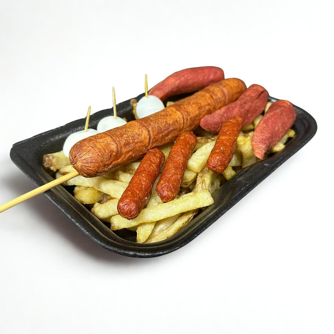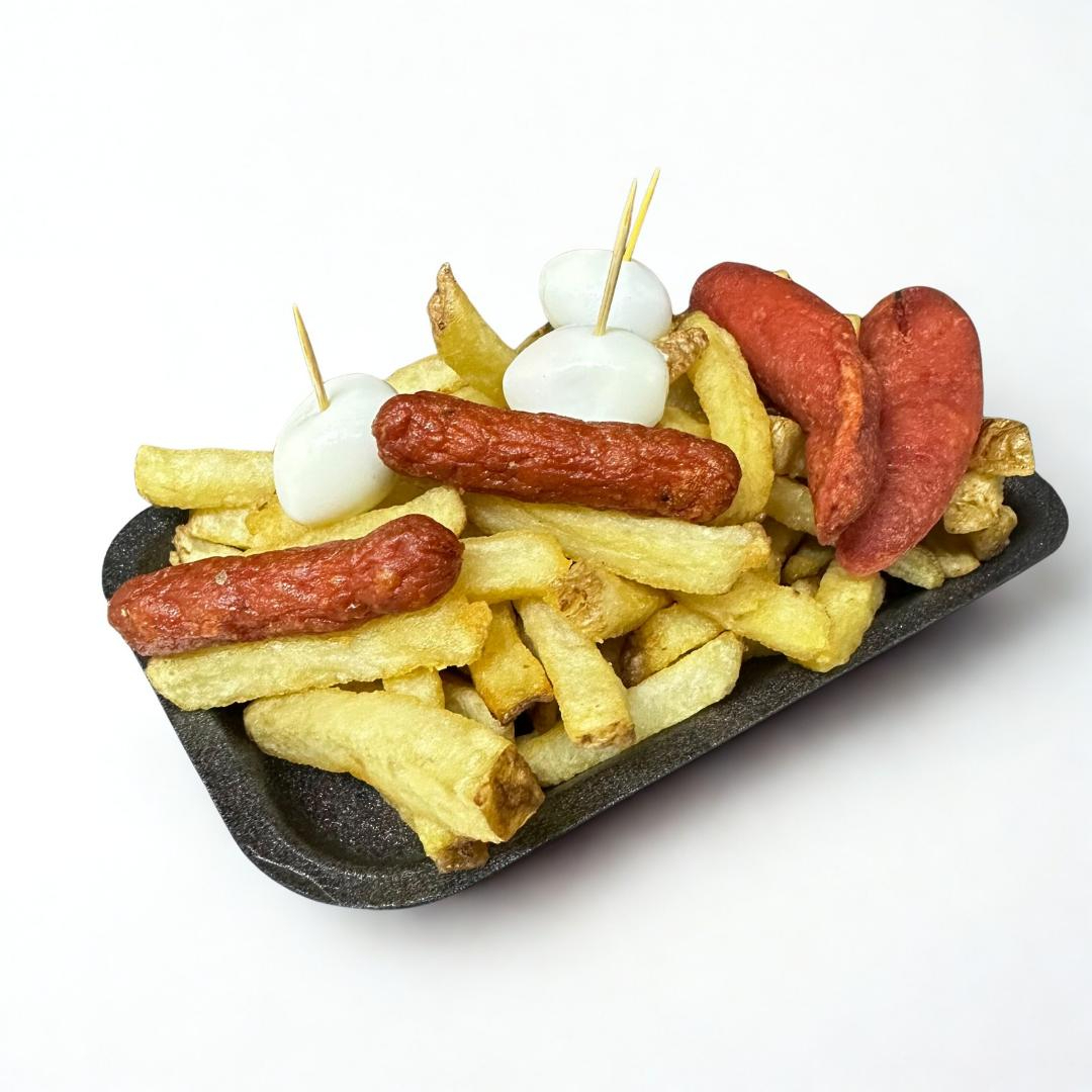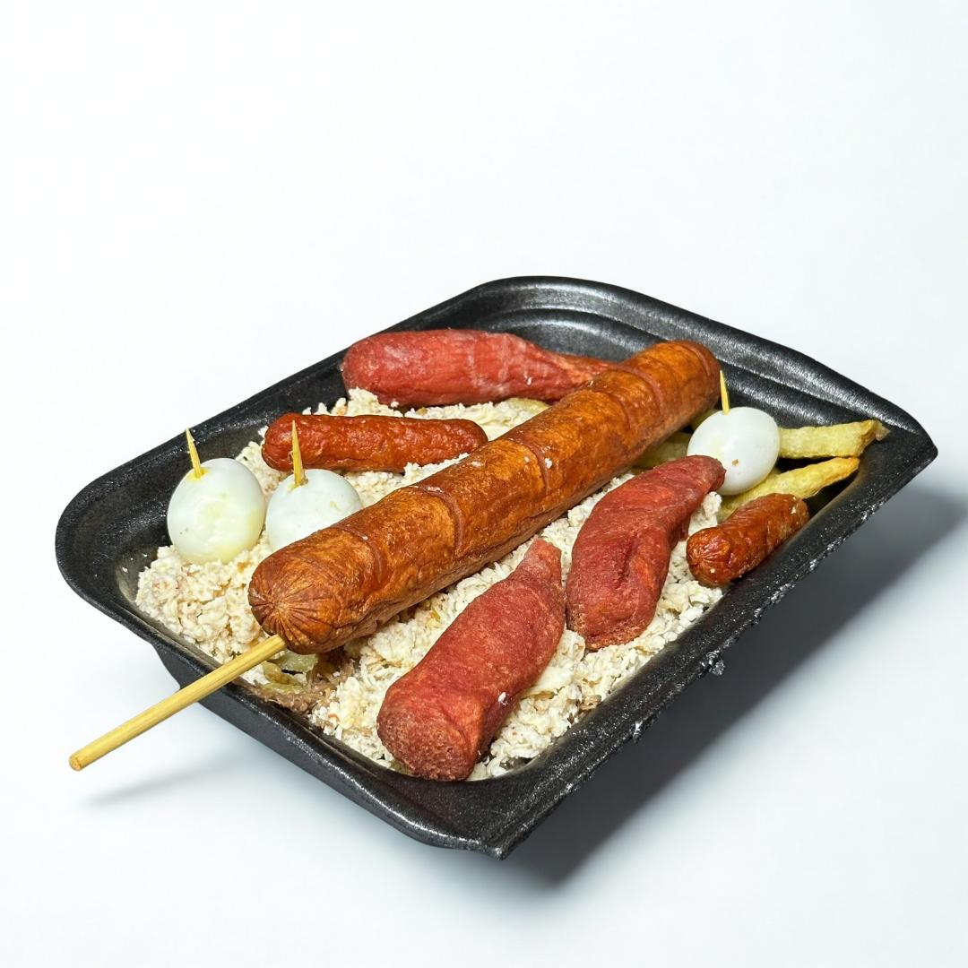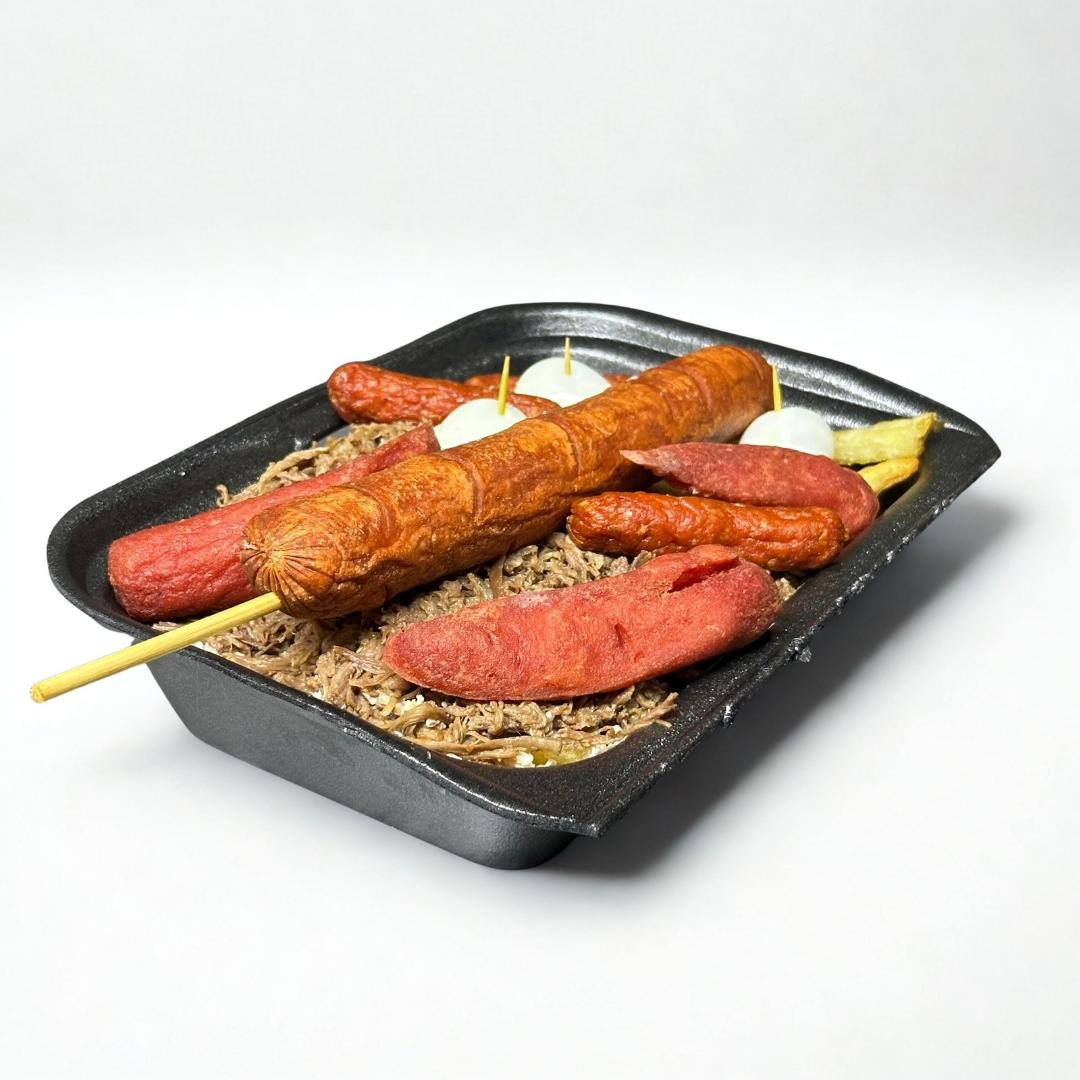 Porción de carne desmechada, 3 Salchichas, 3 huevos de codorniz y 3 chorizos cocteleros