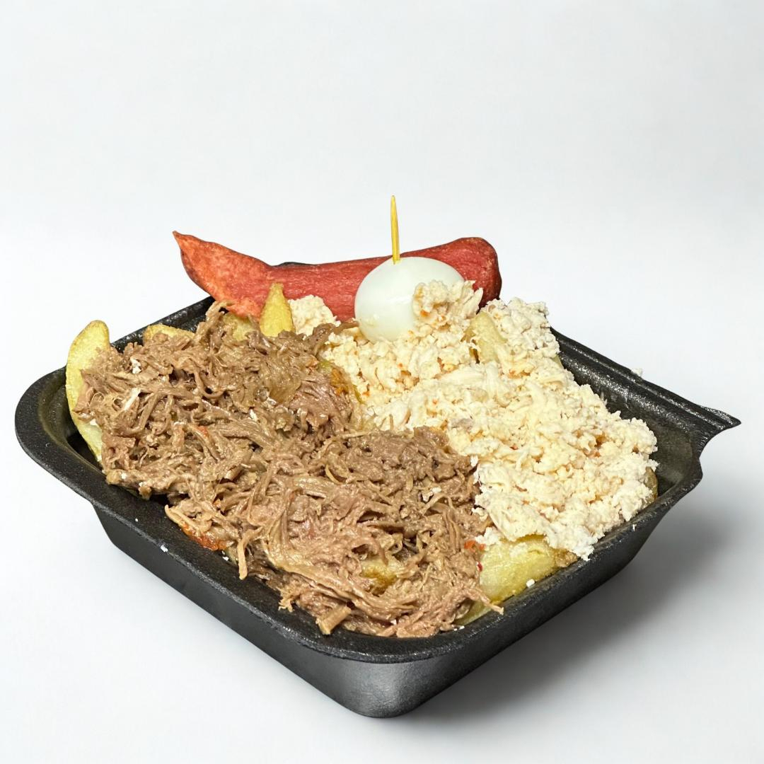 Porción Carne desmechada, 1 Salchicha, 1 huevo de codorniz