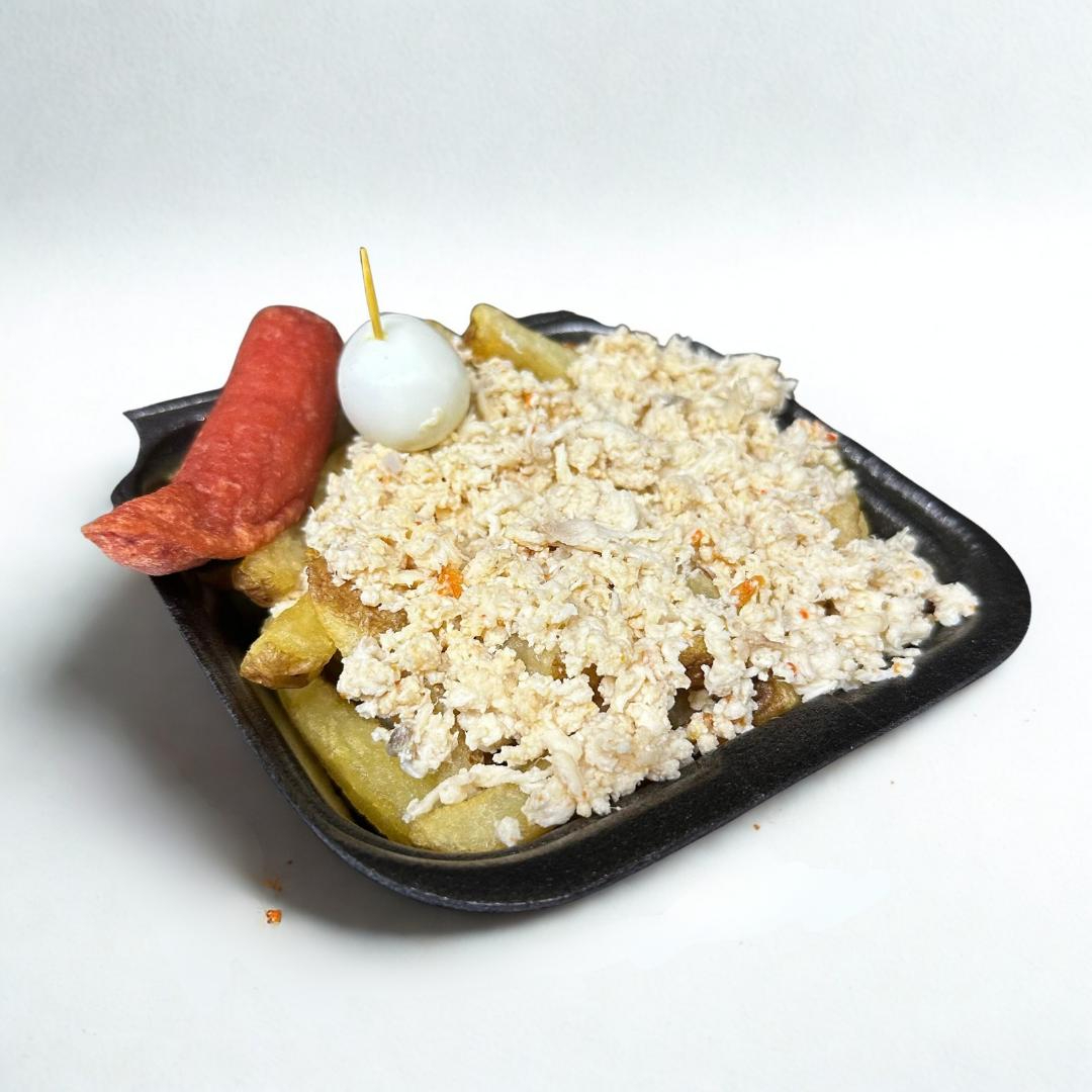 Porción de pollo y Carne desmechada, 1 Salchicha, 1 huevo de codorniz