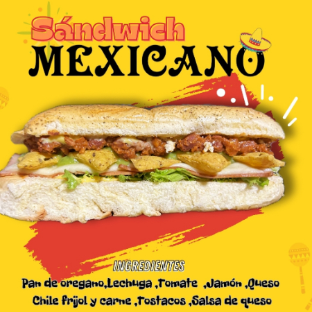 pan de oregano, lechuga, tomate, jamon, queso, chile, frijol,carne, tostacos, salsa cheddar