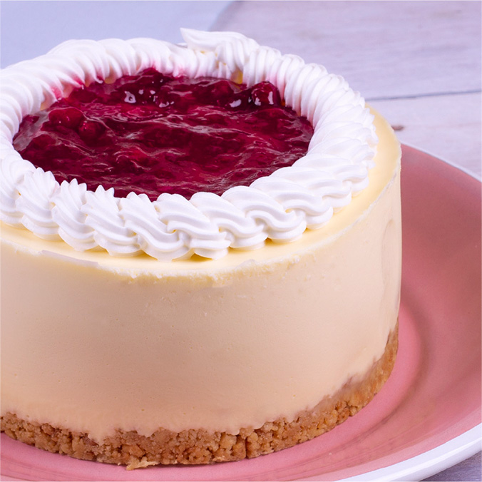 Cremoso postre de leche y queso, sobre una base de galleta crocante y cobertura especial de dulce de mora.