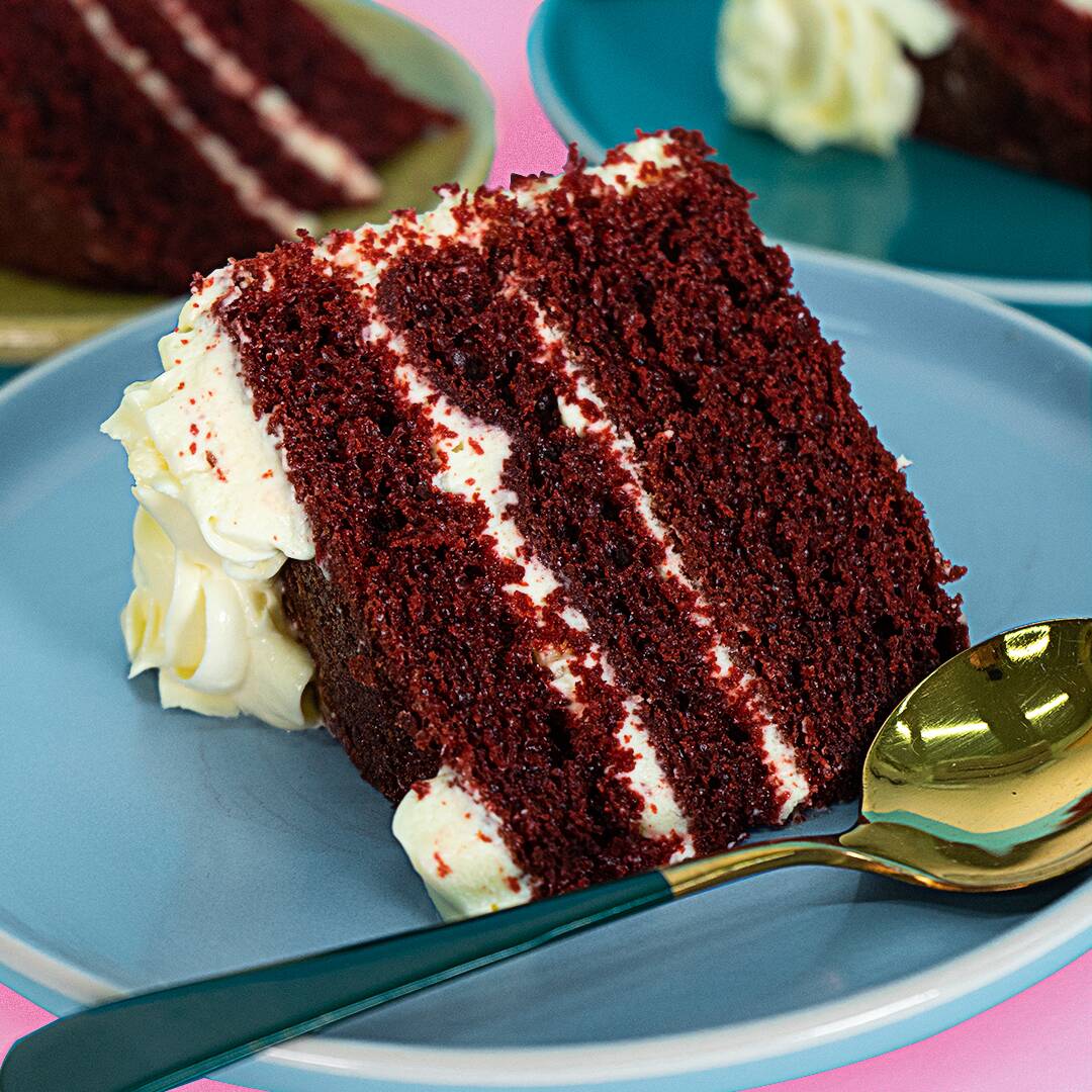 Suave y esponjosa torta de red velvet con queso crema.