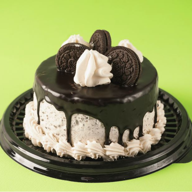 Deliciosa torta con la mejor combinación de vainilla y chocolate, cubierta con una suave crema de merengue galleta y cobertura de chocolate, decorada con galleta oreo