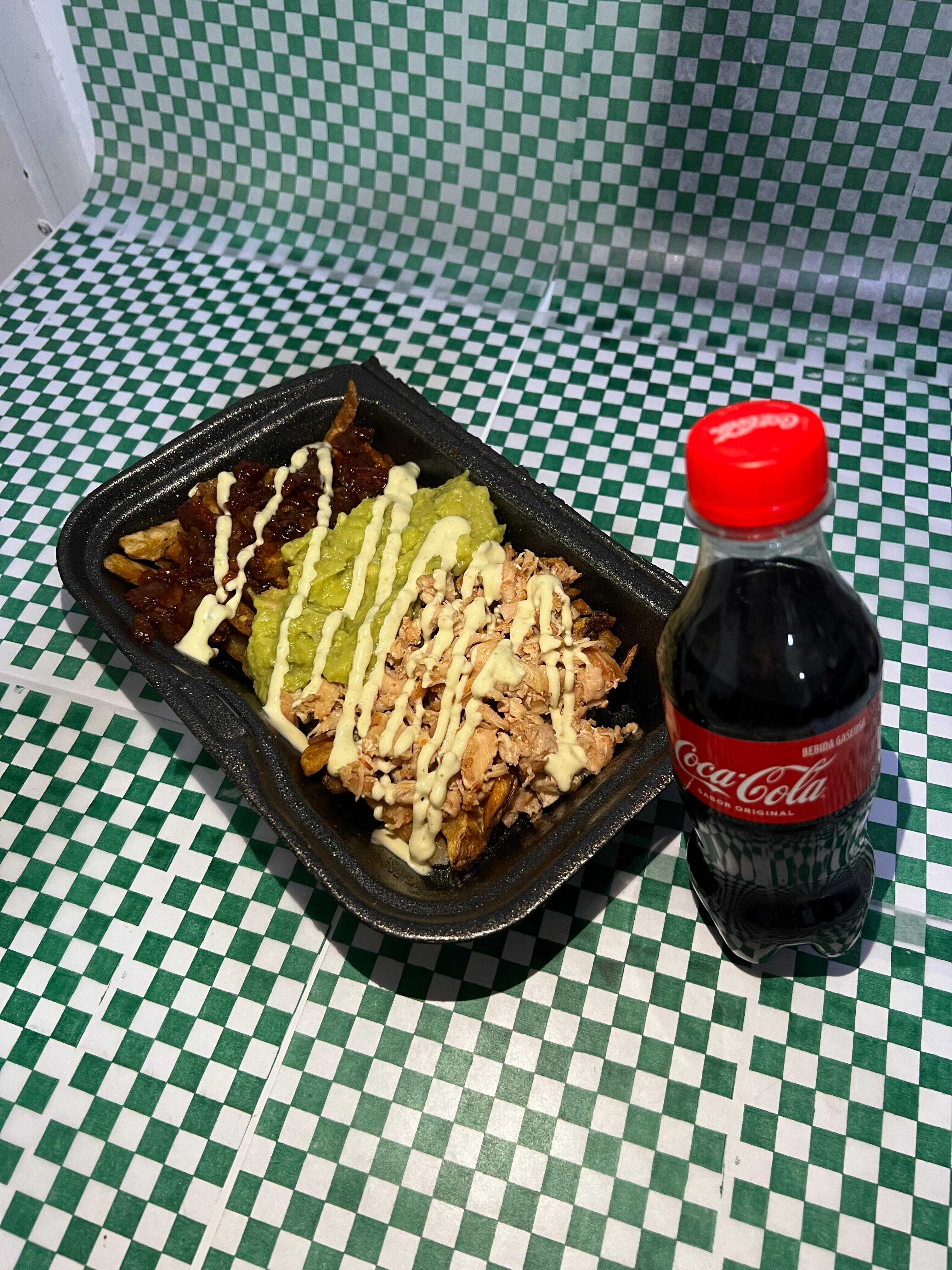 Papa a la francesa, pollo en trozos, guacamole, tocineta caramelizada con cebolla y salsa de la casa. (Porción personal) + Coca Cola 250ml
