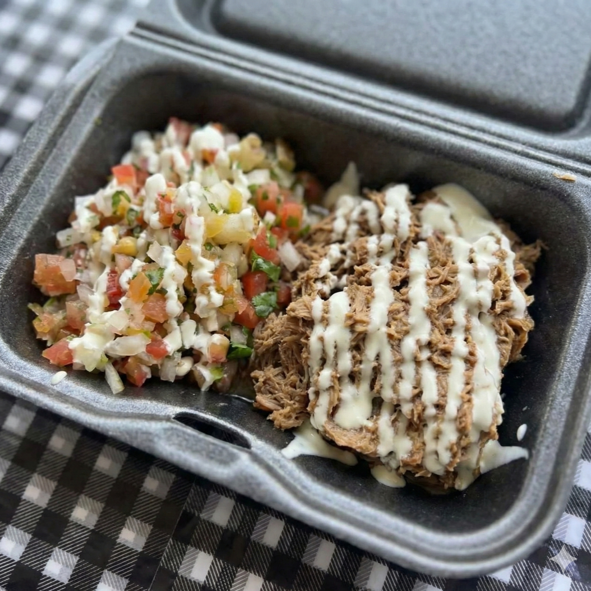 Papas, pulled pork, sour cream, pico de gallo y salsa de la casa.