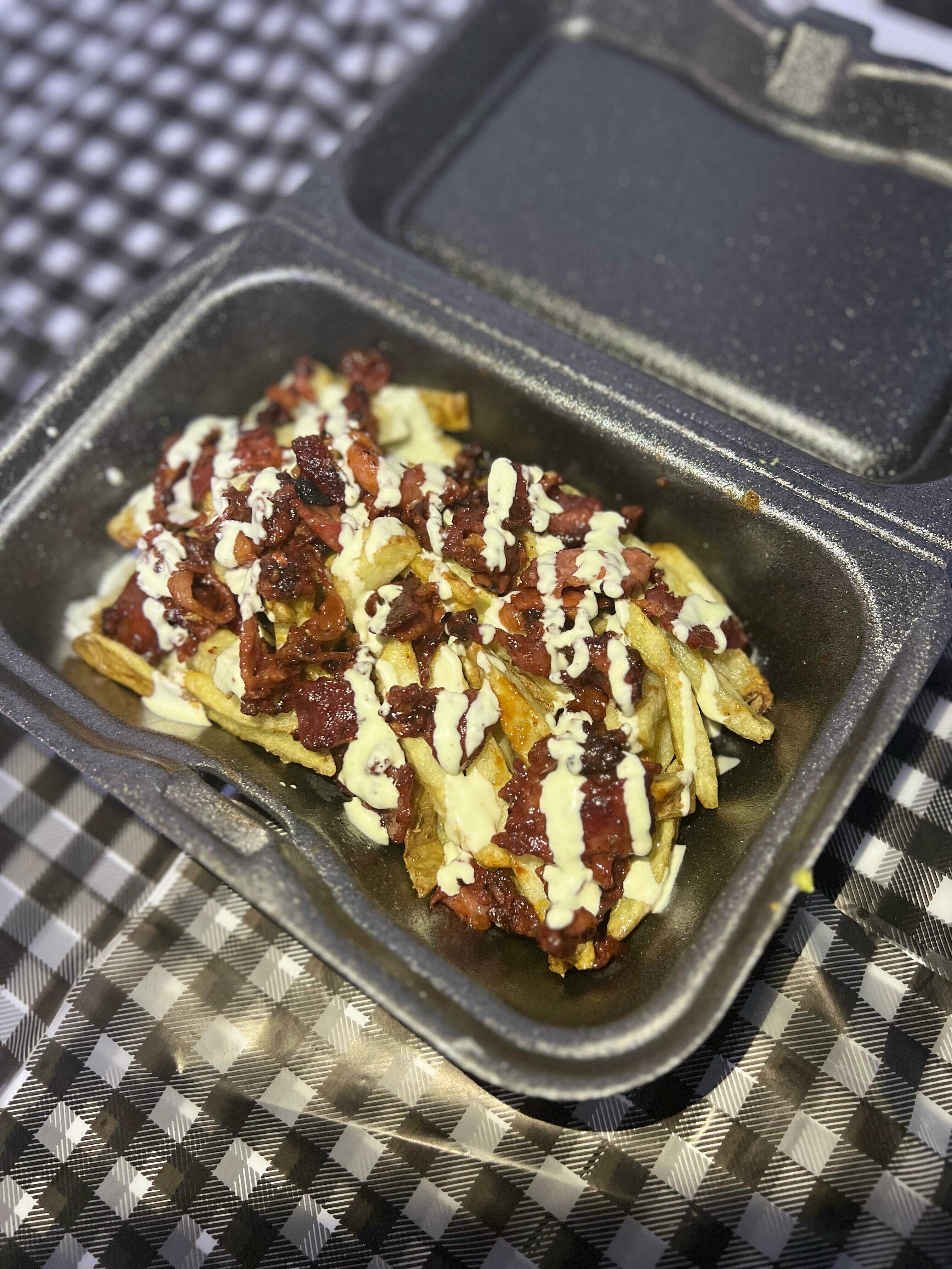 Papa a la francesa, pollo en trozos, guacamole, tocineta caramelizada con cebolla y salsa de la casa. (Porción personal)