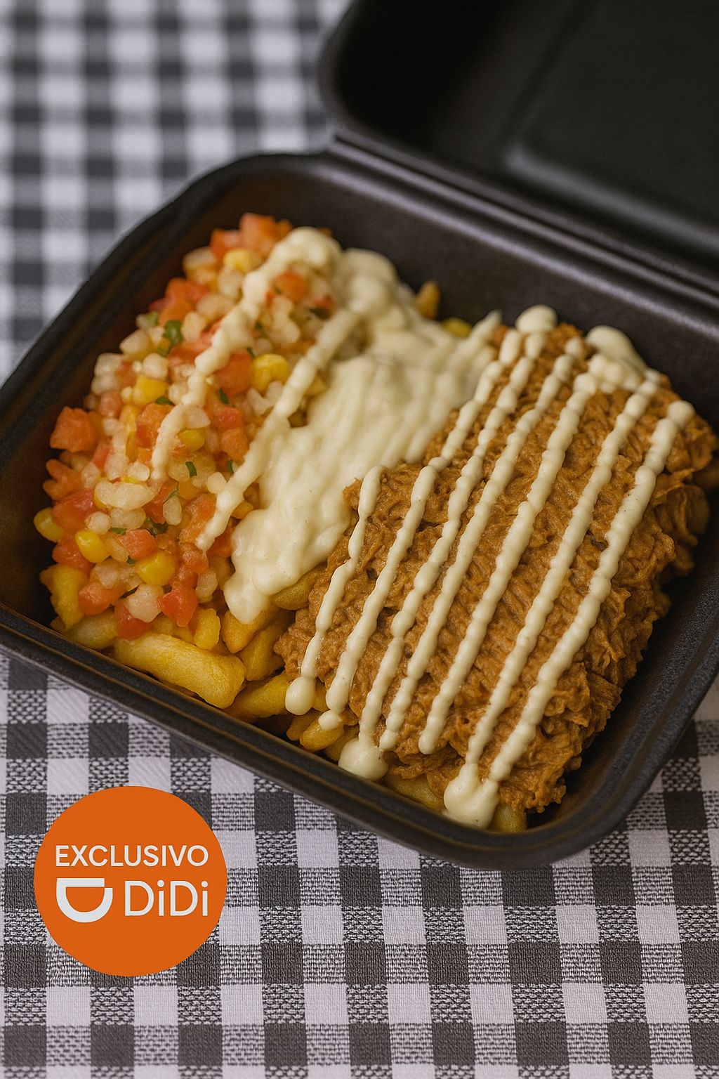 Papas a la francesa (200 g), carne desmechada, guacamole, pico de gallo y salsa de la casa. (Porción personal)