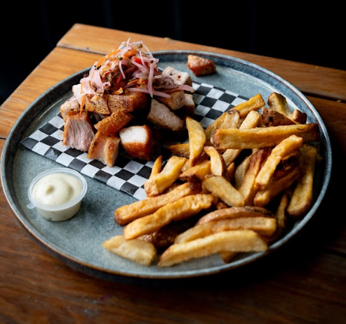 Papas a la francesa, bondiola de cerdo bañada en bbq especial, chicharrón crocante, guacamole, queso fresco y salsa de la casa.