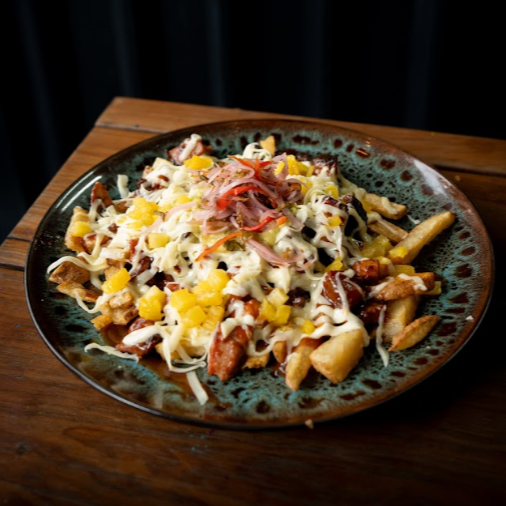Papas a la francesa con bondiola bañada en salsa bbq especial, piña ahumada, cebollas acevichadas, guacamole, queso fresco y salsa de la casa.