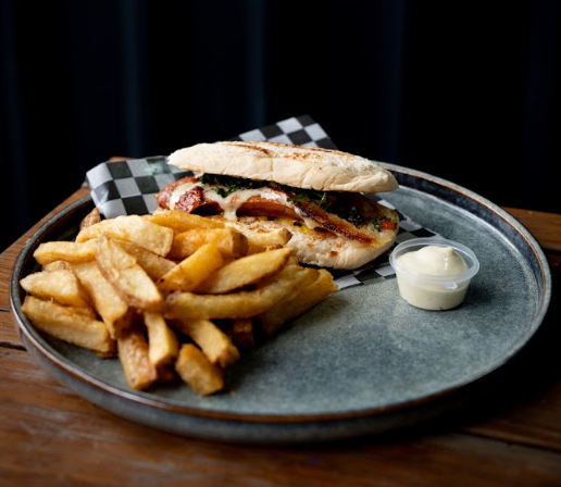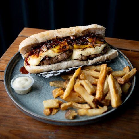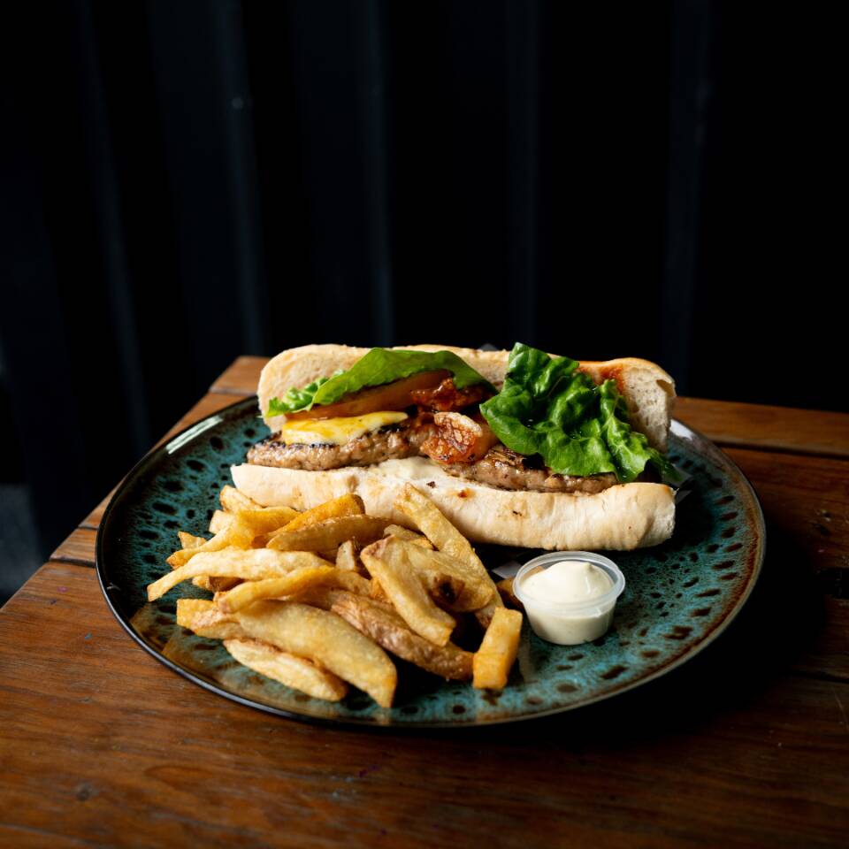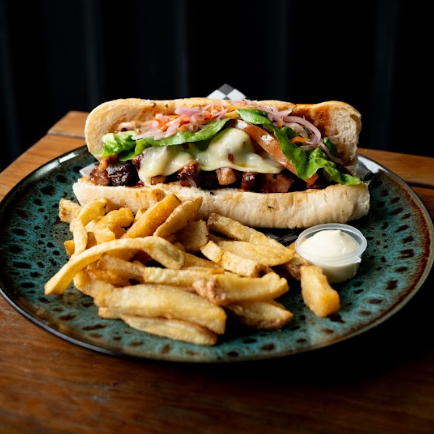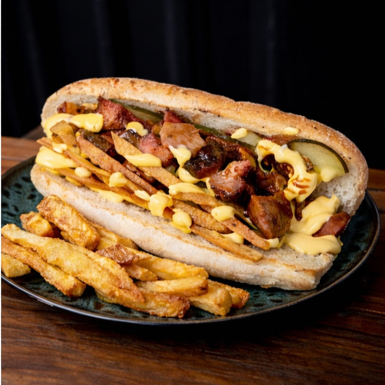Bondiola, queso mozzarella asado, piña ahumada, cebollas crunch, salsa sweet le pork, salsa bbq sobre pan ciabatta, con papas.
