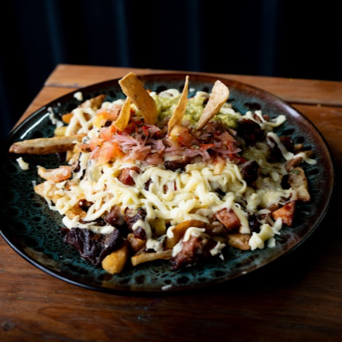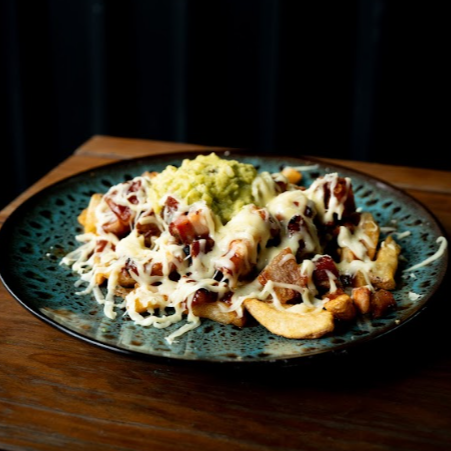 Papas a la francesa, bondiola ahumada al barril bañada en bbq especial, sour cream, pico de gallo, guacamole y totopos.
