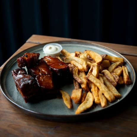 Costillas carnudas bañadas en bbq especial o bbq picante, acompañada de papas a la francesa y salsa de la casa.