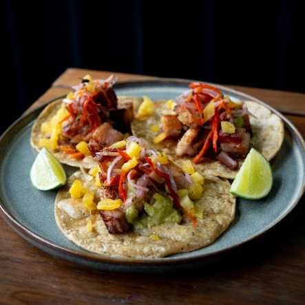 Arepitas x3 con chicharrón crocante acompañado de guacamole, cebollitas acevichadas, cilantro, piña ahumada y salsa de panela.