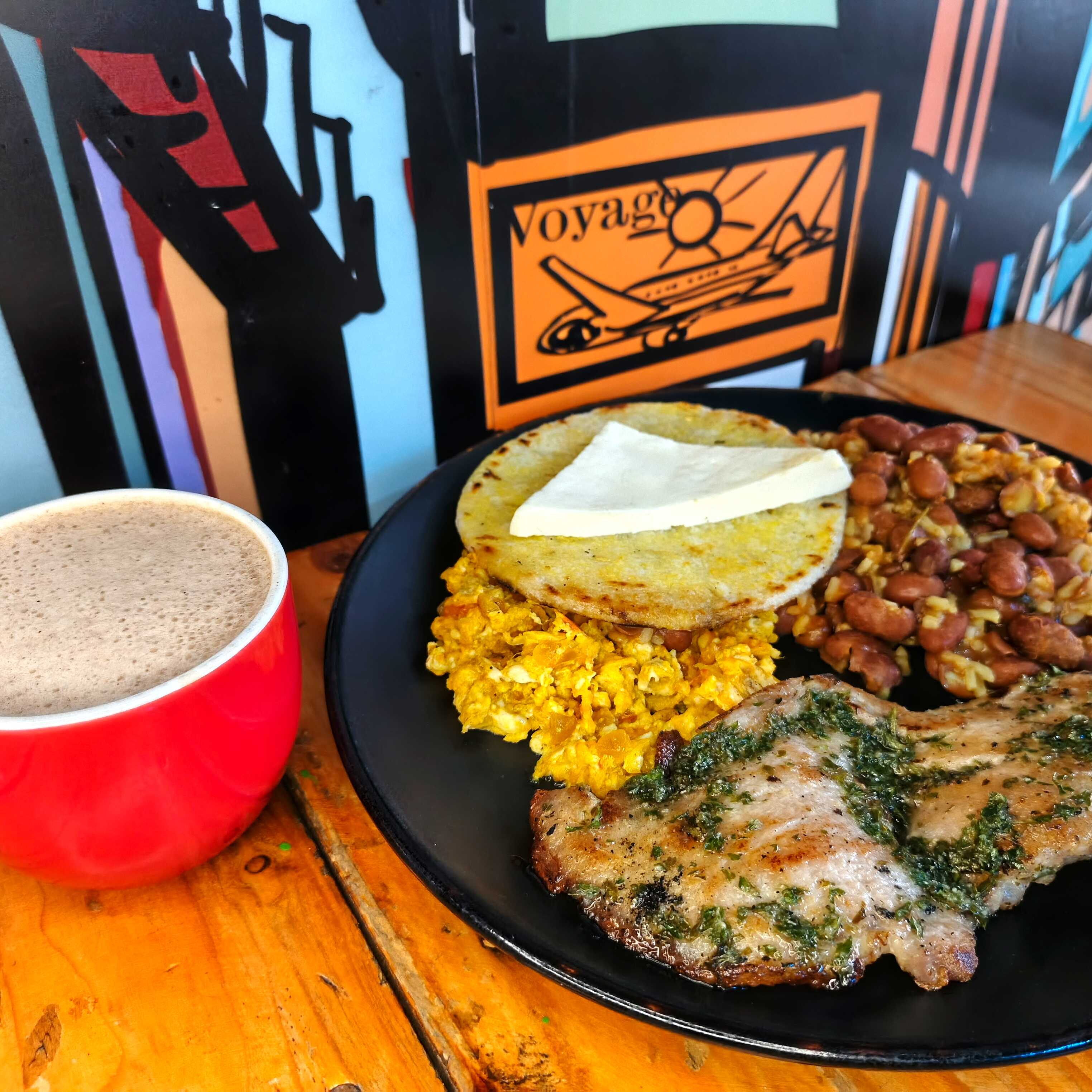 Frijoles con arroz, huevos revueltos con aliños, arepa tostada untada con matequilla y queso (carne de res, cerdo, chicharron, pollo a la plancha o carne molida), con sobremesa (cafe o chocolate)