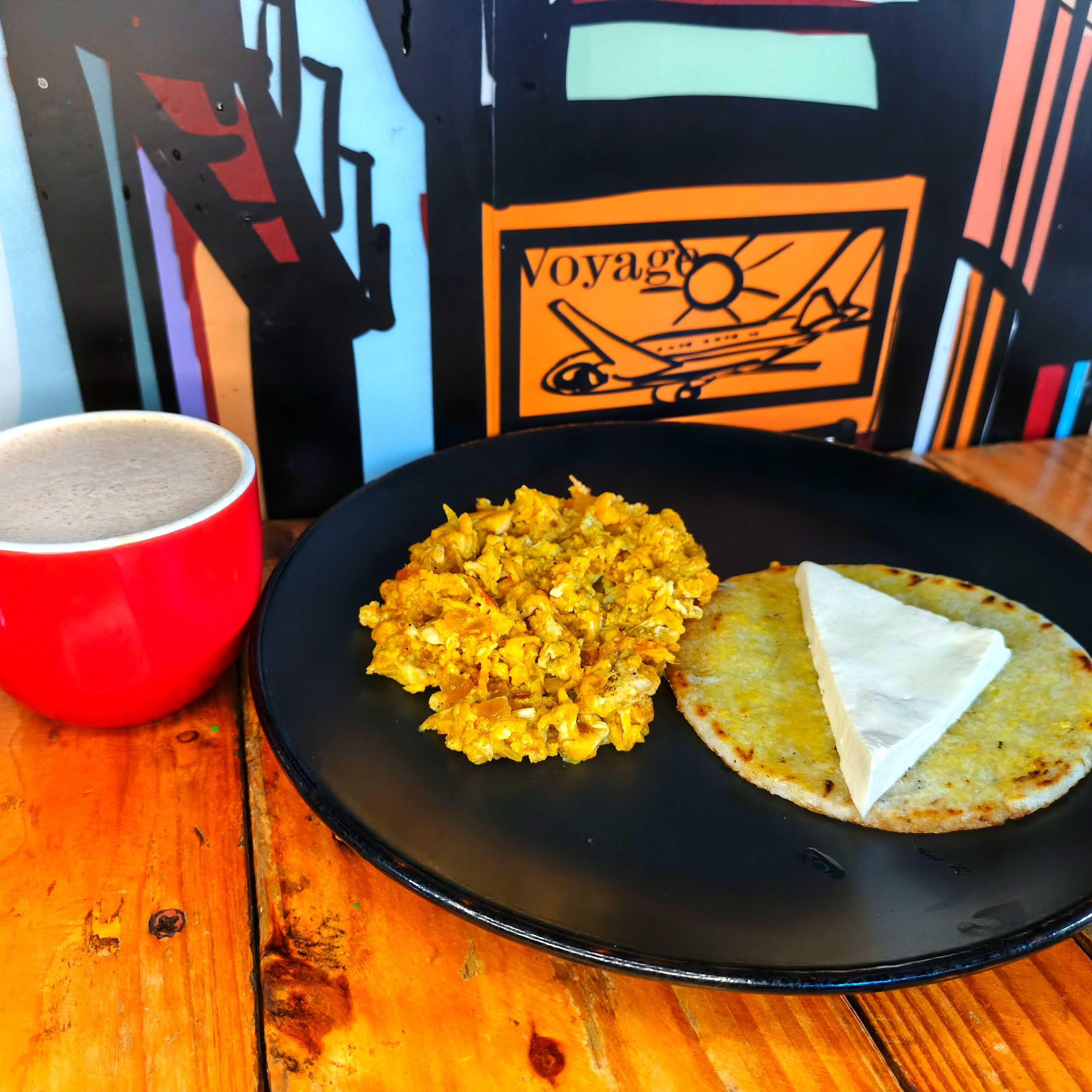 Huevos revueltos con aliños acompañado de arepa tostada untada de mantequilla con queso y sobremesa (cafe o chocolate)