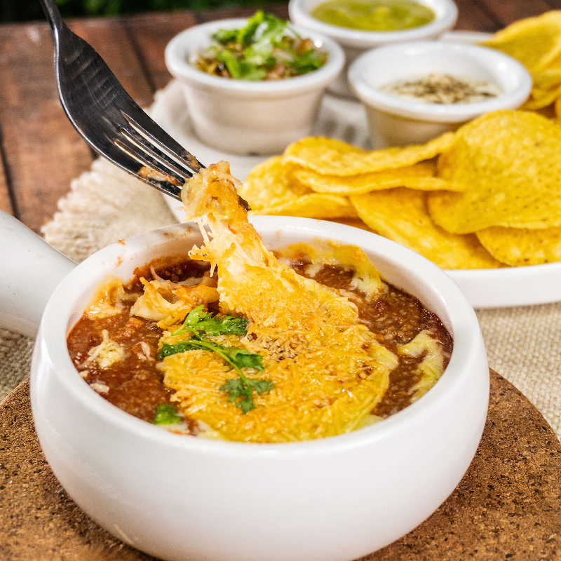 Crujientes tortillas con carne boloñesa gratinada, acompañadas de guacamole, pico de gallo y crema de queso.