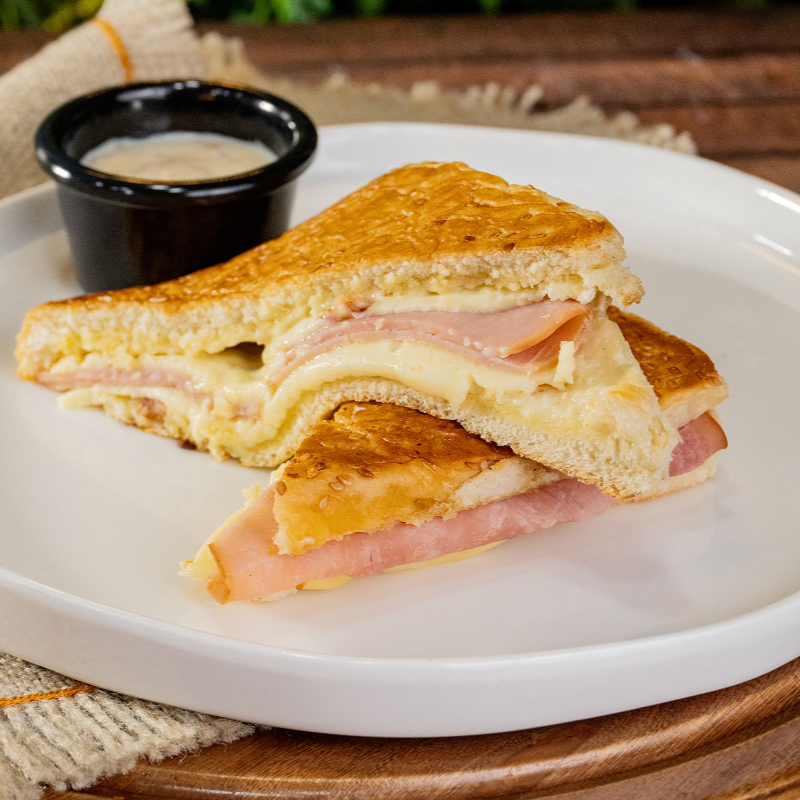 Pan danés dorado en mantequilla, relleno con jamón suave y queso mozzarella fundido.