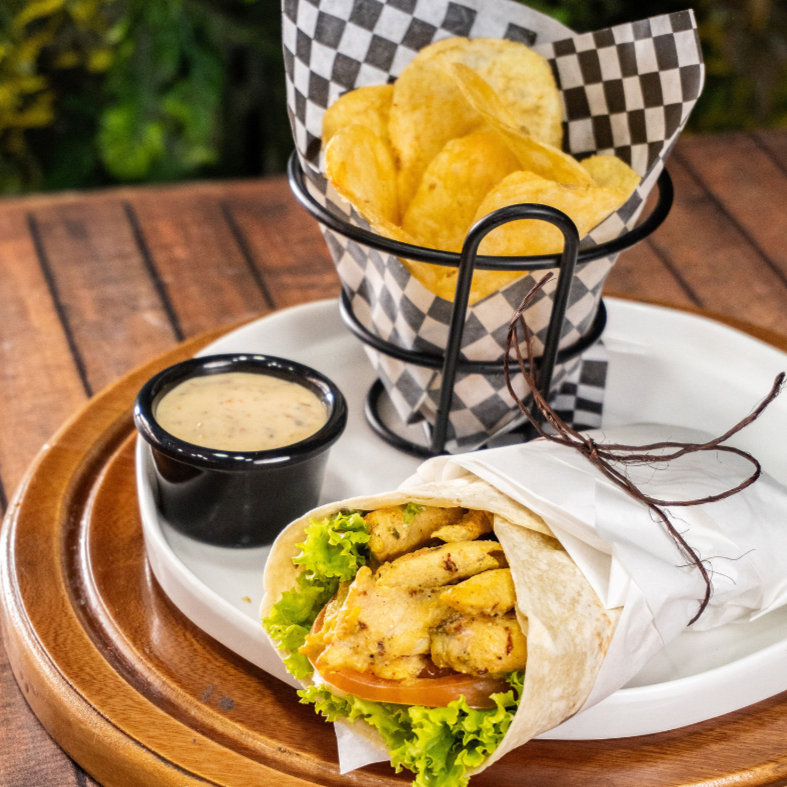 Tortilla rellena con 150 g de pollo en julianas con mostaza y finas hierbas, salsa cremosa de pimentón y cilantro, lechuga fresca, tomate marinado y queso mozzarella, acompañado con papas BBQ dulces.