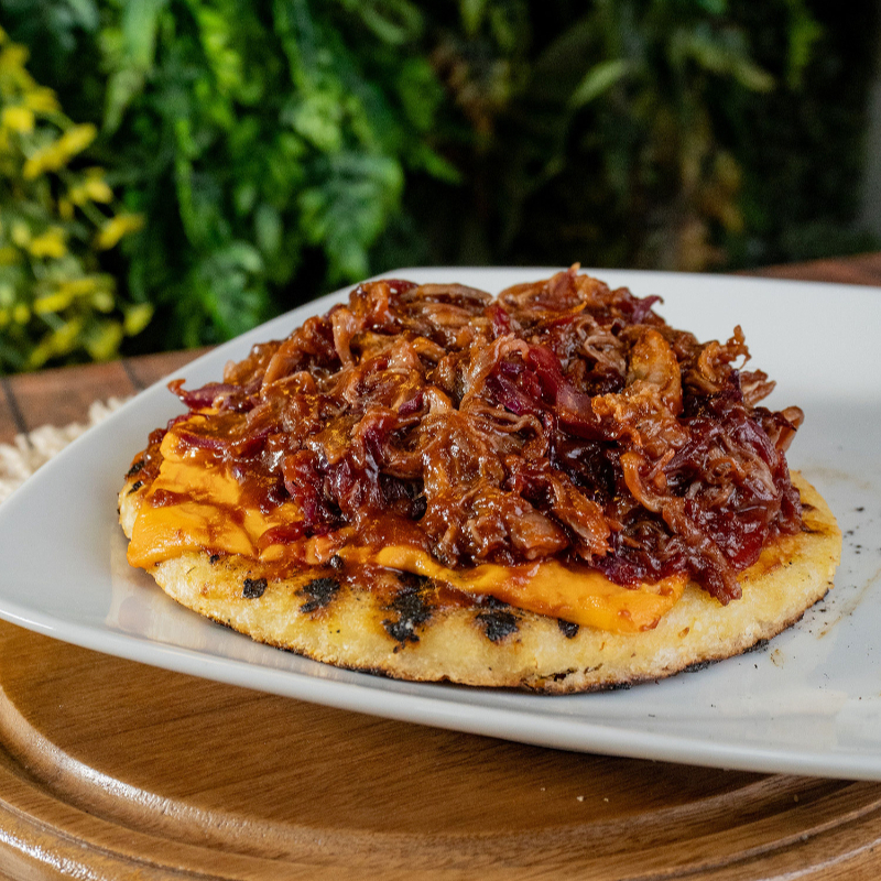 Arepa de maíz blanco, servida con nuestra carne en preparación especial sobre queso amarillo fundido.