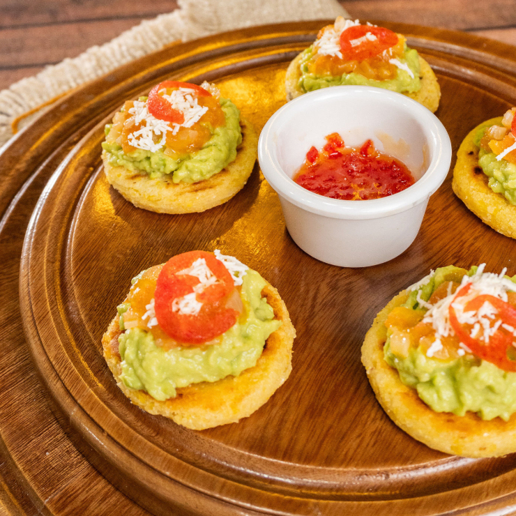 5 mini arepas crocantes al sartén, cubiertas con guacamole, hogao tradicional, queso costeño rallado, acompañadas de mermelada de ají.