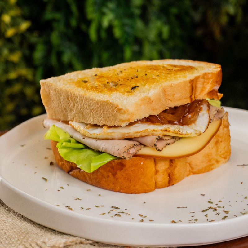 Pan artesanal dorado en mantequilla de parmesano y orégano, con lechuga fresca, jamón de pavo, queso ahumado, huevo y cebolla caramelizada.