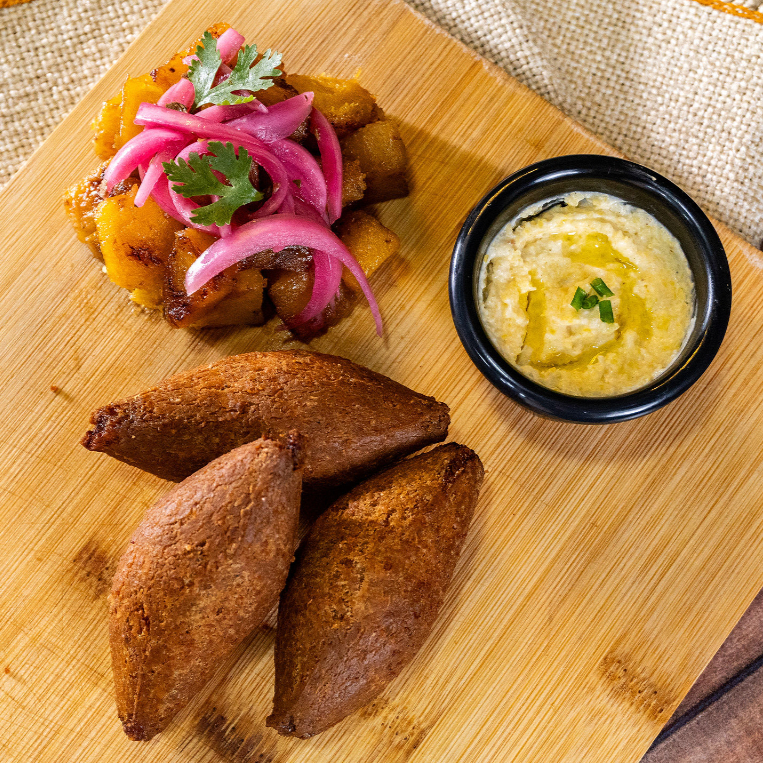Kibbes tradicionales de carne, servidos con hummus de la casa, ensalada tibia de plátano maduro en cubos y cebolla encurtida criolla.