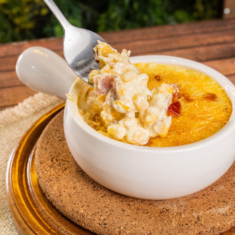 Dulces granos de maíz en cremosa salsa con trocitos de tocineta y queso mozzarella, gratinados al horno con una capa dorada de queso parmesano.
