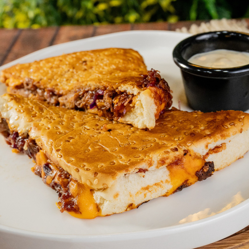 Pan danés dorado en mantequilla de ajo, relleno con nuestra carne desmechada y queso amarillo fundido.