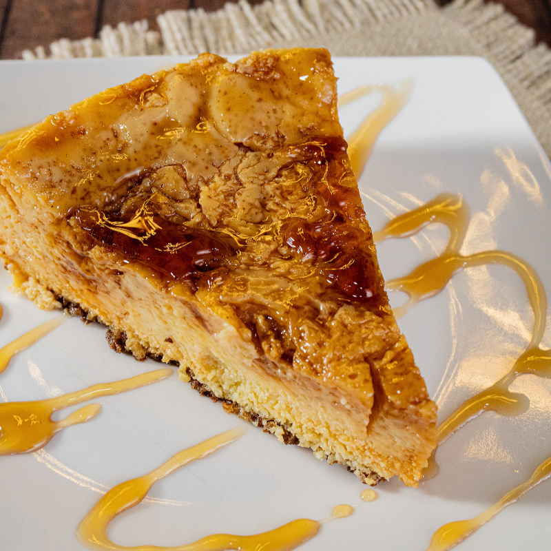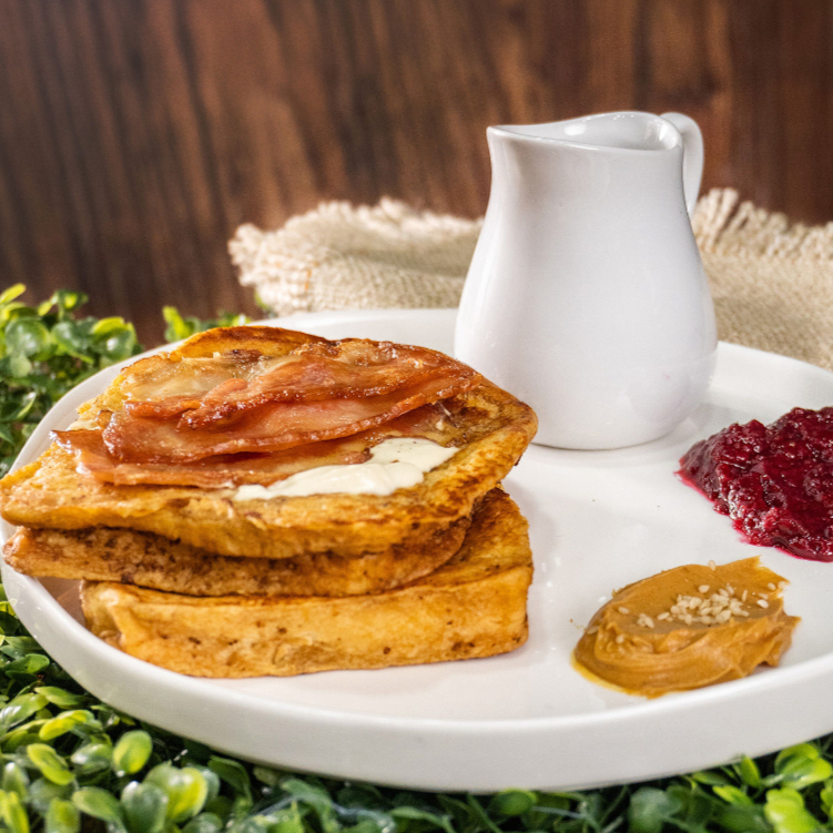 Tostadas francesas doradas al punto perfecto, con un toque de canela, crema de queso, mantequilla de maní suave, confitura de mora, crujiente tocineta glaseada y miel de maple tibia.