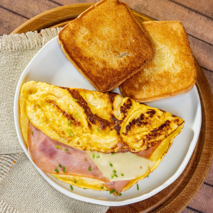 Huevos batidos al punto justo, rellenos de jamón suave, queso derretido y un toque de cebollín fresco.