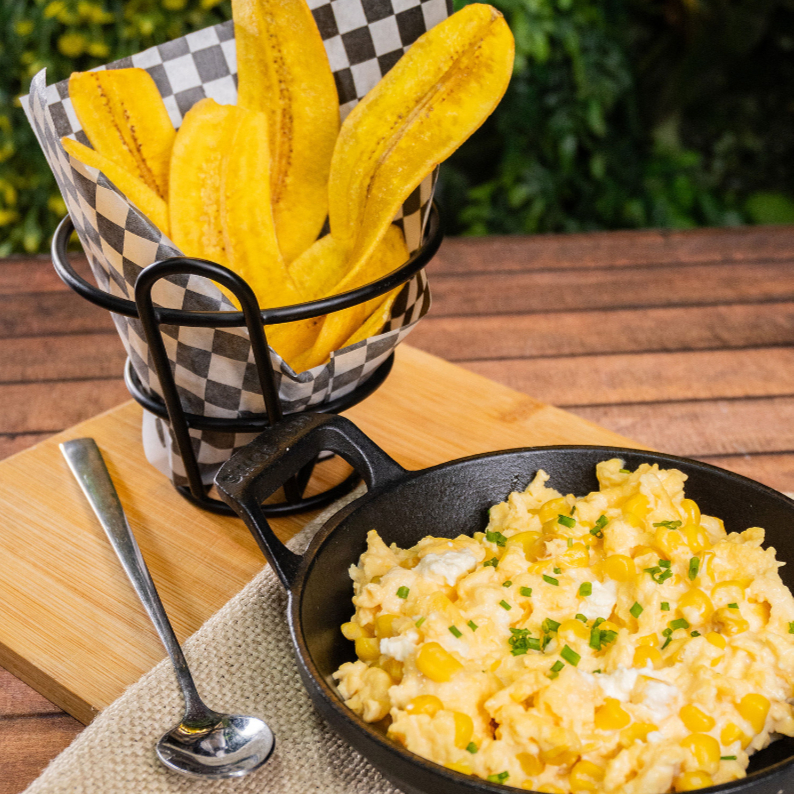 Huevos en crema de queso, con maíz dulce y un toque de cebollín, acompañados con chips de plátano crujiente.