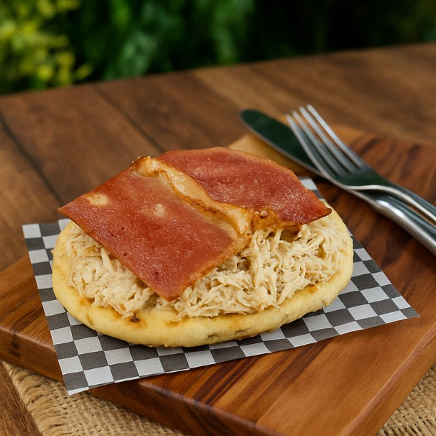 Arepa de maíz blanco servida con cremoso pollo y crocante tocineta sobre queso mozzarella.
