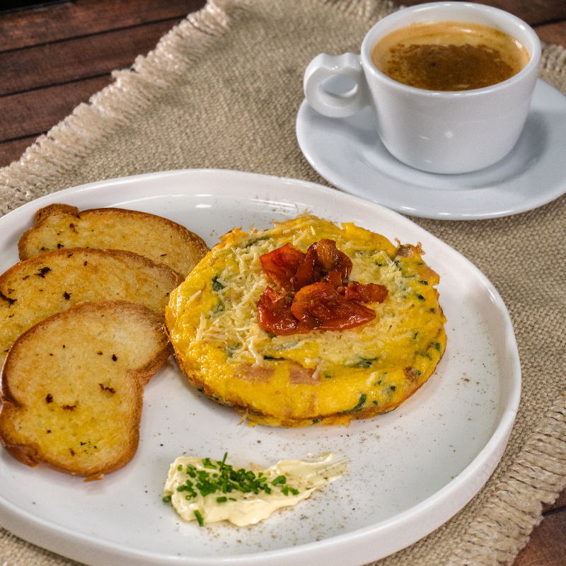 Huevo batido con espinaca, albahaca y jamón, cocinado lentamente y cubierto con quesos derretidos, un toque final de tomates asados, acompañado con pan tostado.