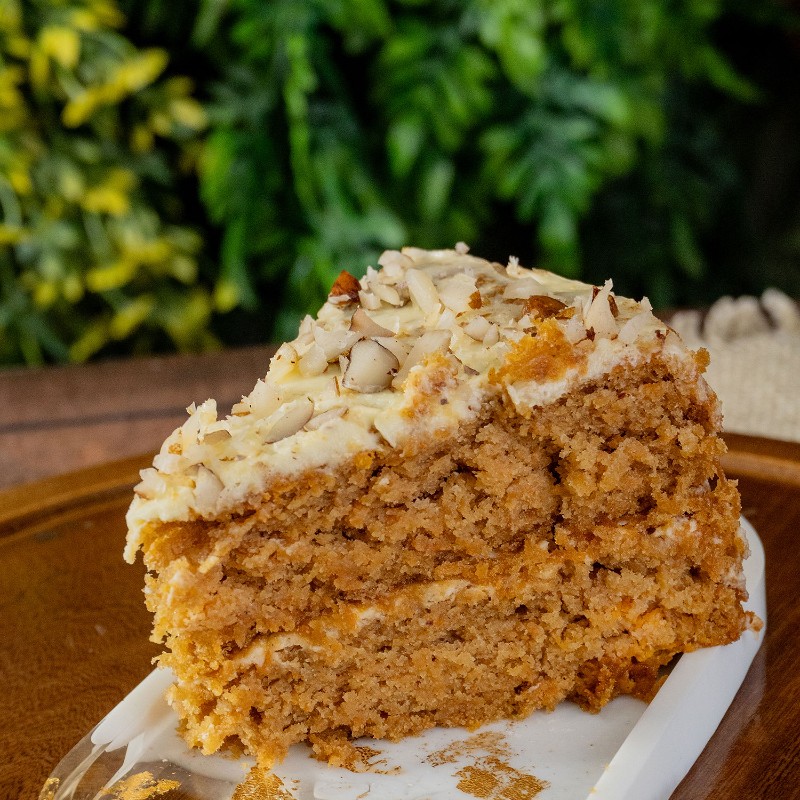 Porción de torta de zanahoria, cubierta con ralladura de coco.