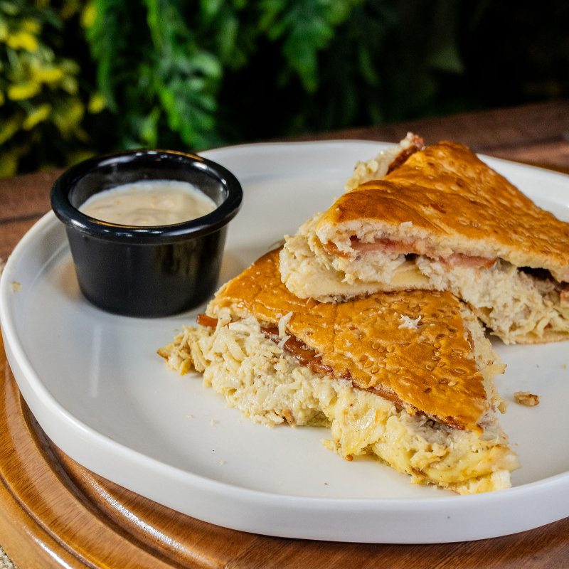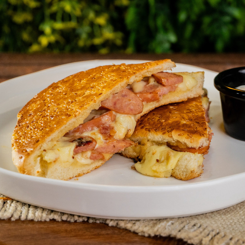 Pan danés tostadito en mantequilla, relleno de pollo cremoso, tocineta crocante y queso mozzarella derretido. Acompañado con salsa de la casa.