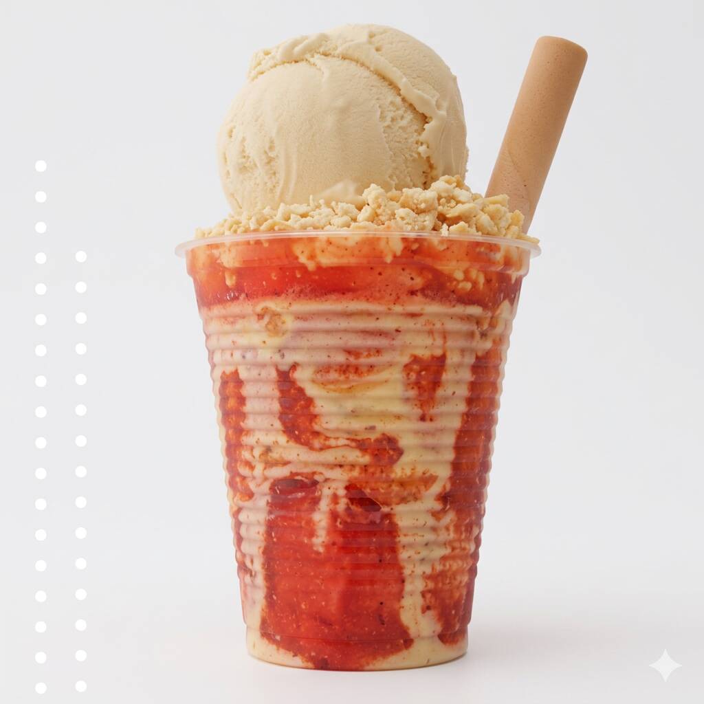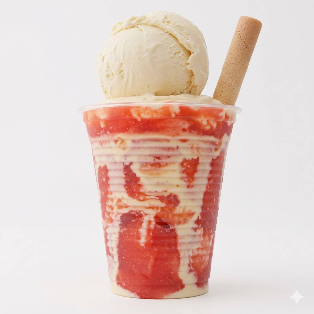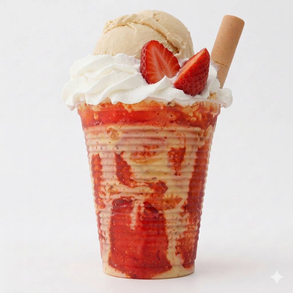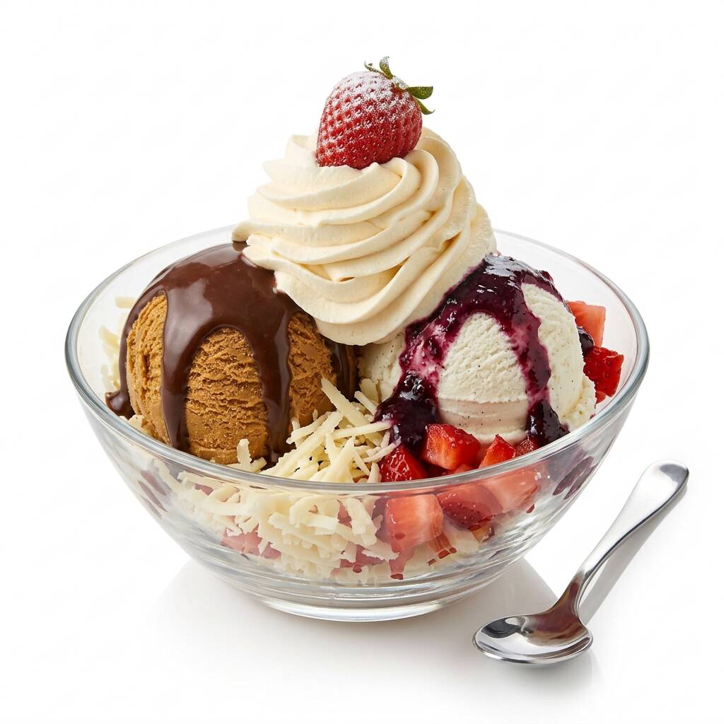 2 sabores de helados, queso rallado, fresas en trozos, chantilly barquillo y salsa