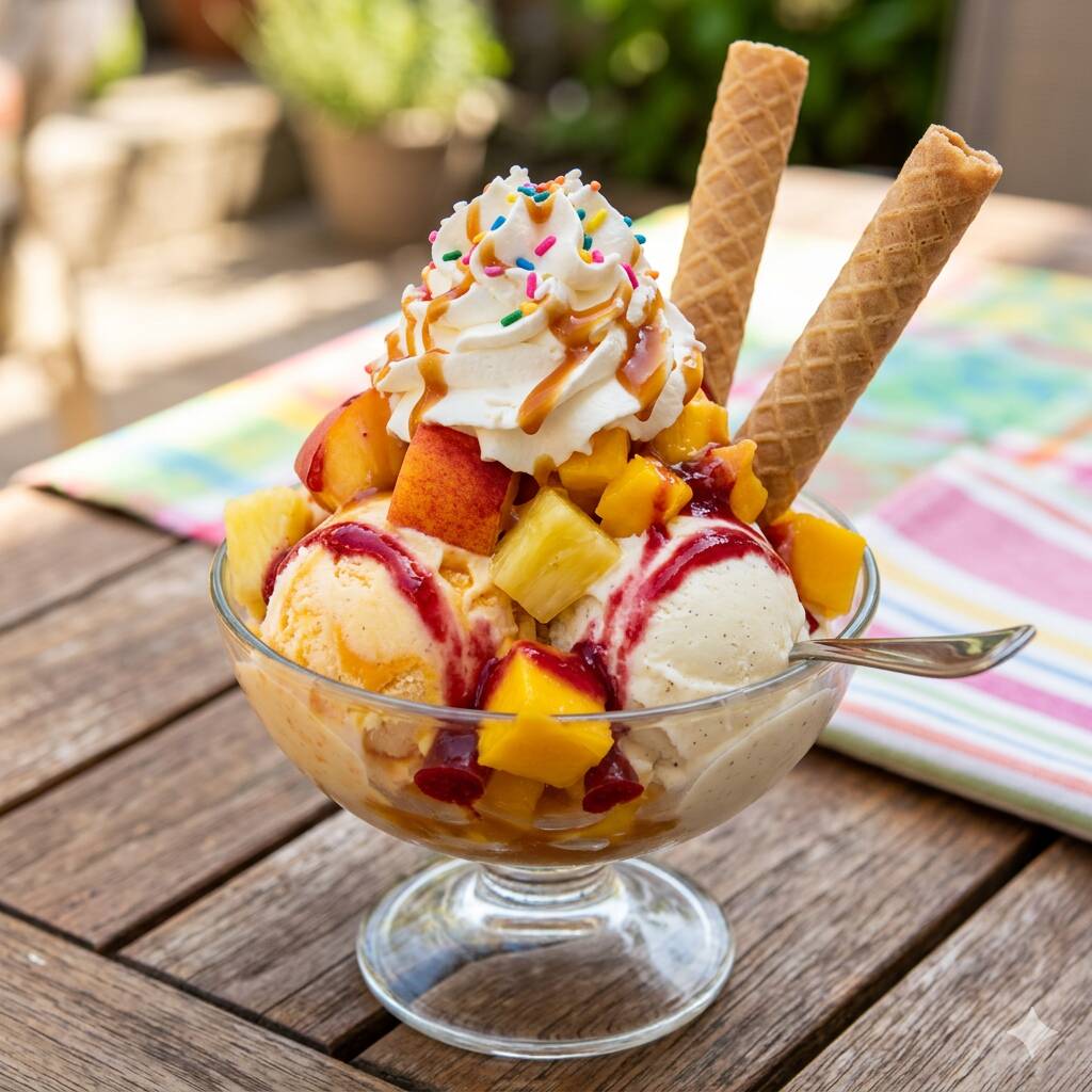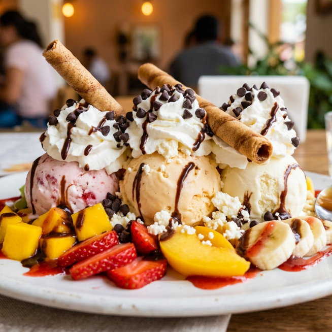 2 sabores de helados, durazno en trozos, piña, mango, chantilly, barquillos y salsas