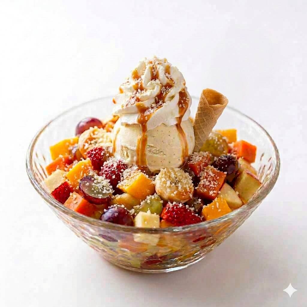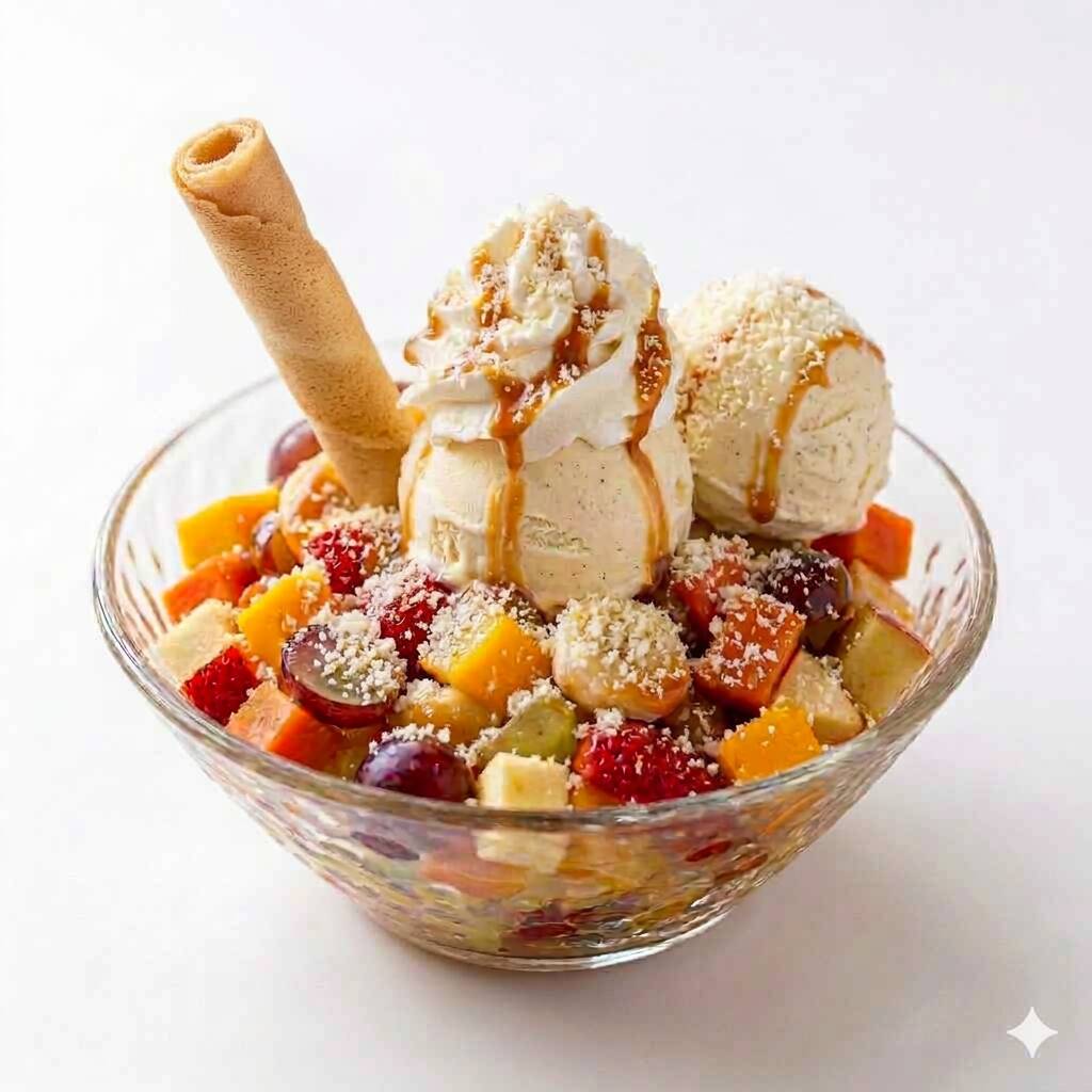 Mezcla de frutas, 1 sabor de helado, queso, barquillo, salsa