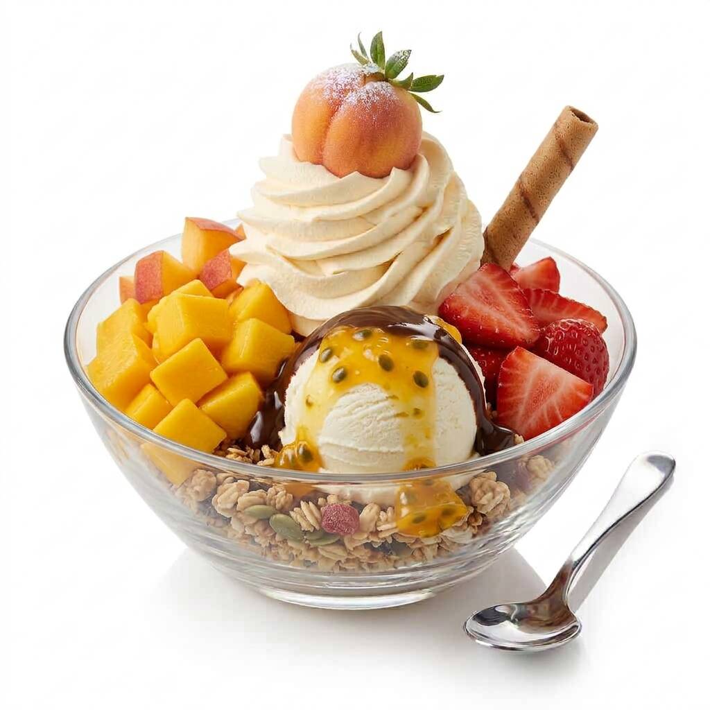 1 sabor de helado, crema de maracuya, cereal de granola, durazno, mango, fresa, chantilly, barquillo y salsa