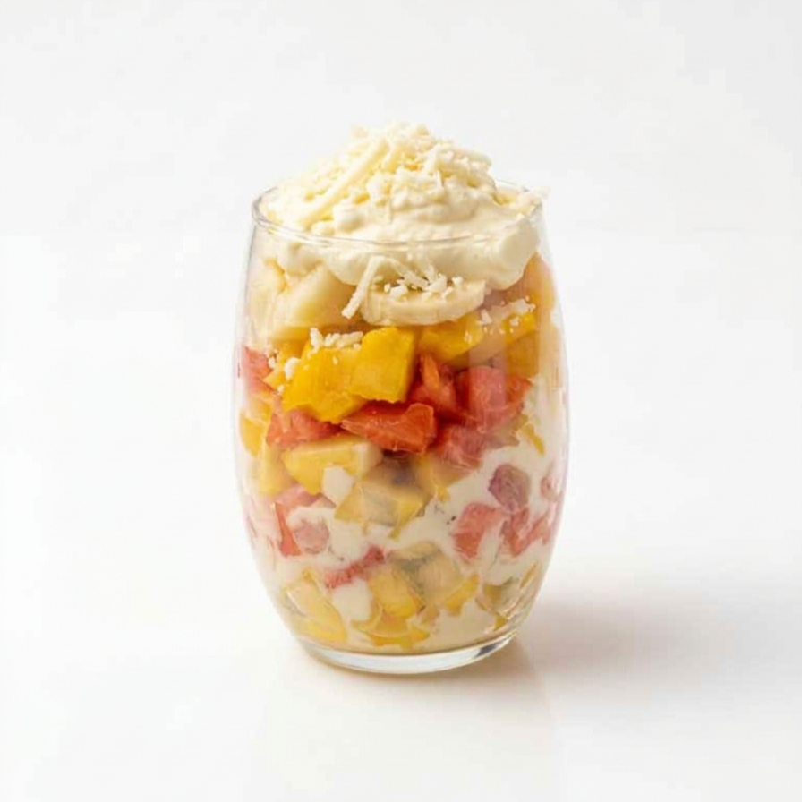 Mezclas de frutas, queso rallado y crema de leche