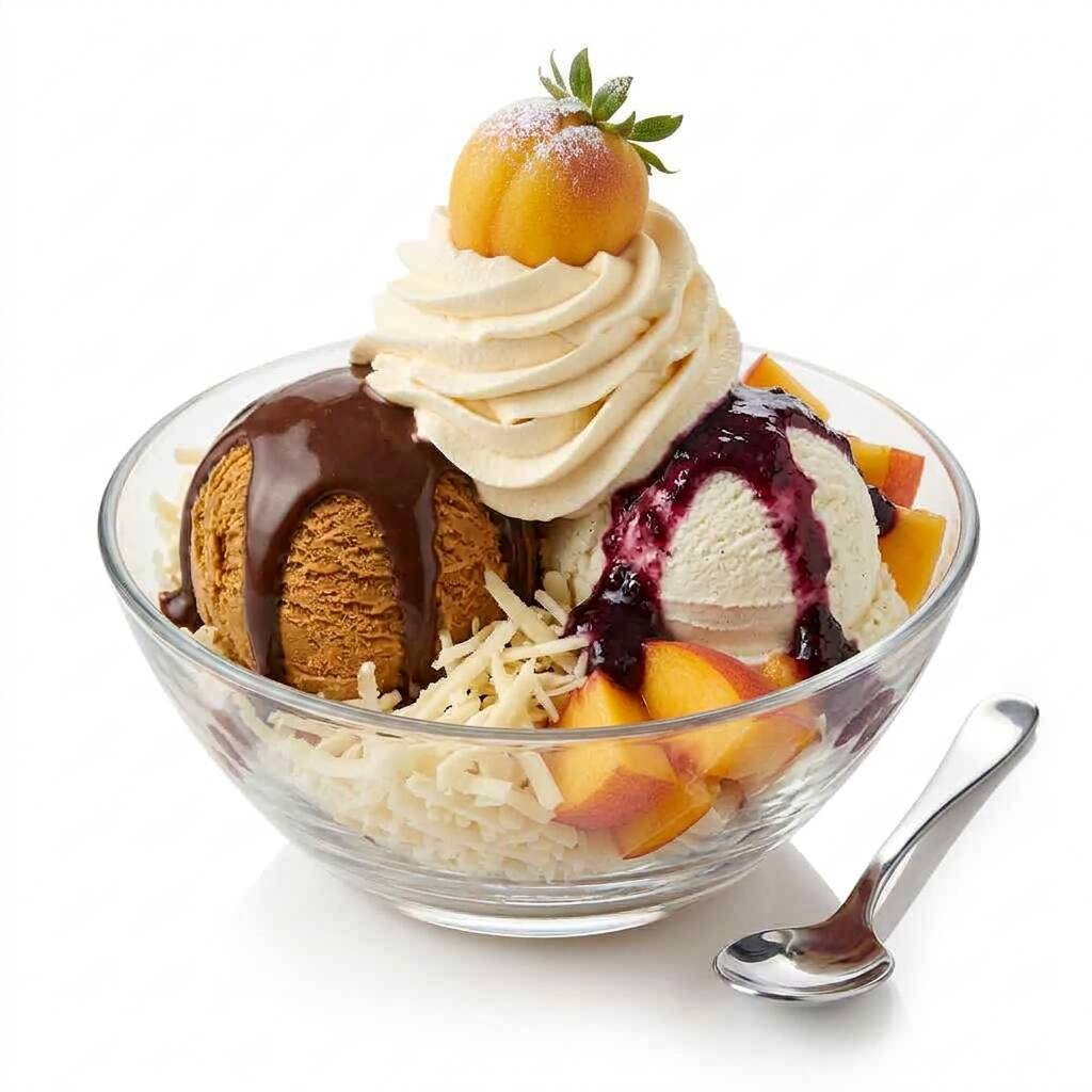 2 sabores de helados, queso rallado, durazno en trozos, chantilly, barquillo y salsa