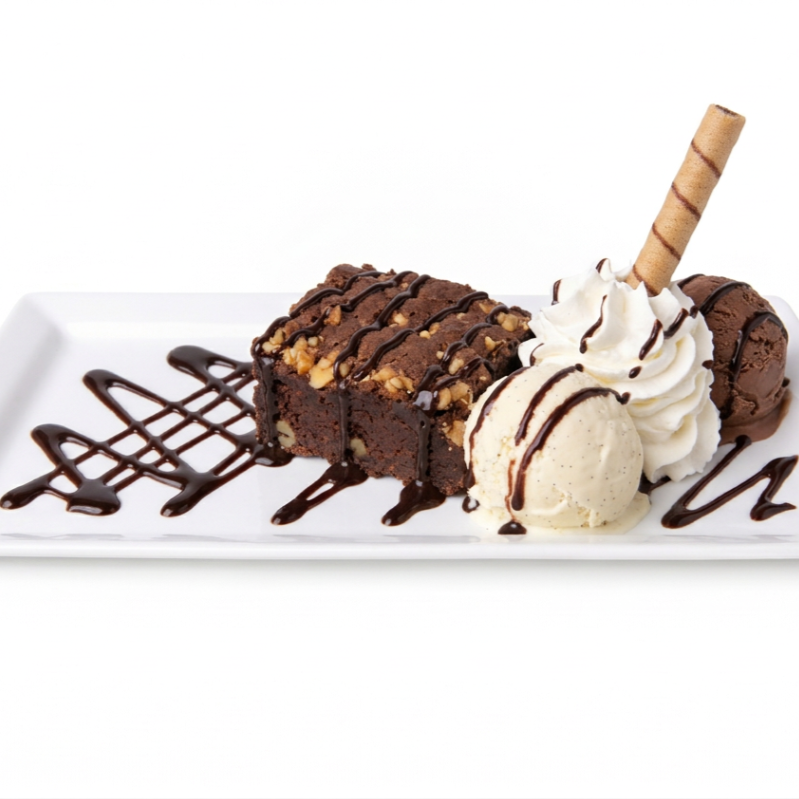 Brownie, 2 sabores de helados, chantilly, barquillo y salsas