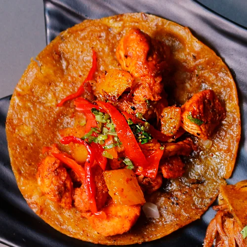 Tortilla de maíz dorada, carne de cerdo al pastor, piña asada, cebolla encurtida, cilantro y ají dulce.