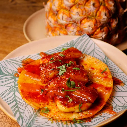 Tortilla de maíz dorada, queso asado, piña dulce, salsa de guayaba, Tajín y chamoy.