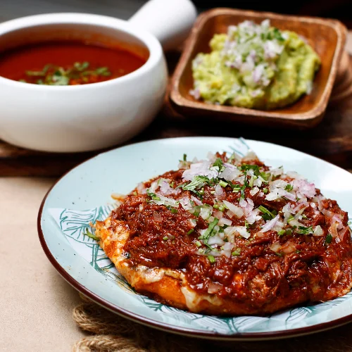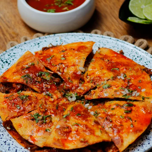 2 Tortillas de harina doradas, 300 g de jugosa carne de birria de res, queso mozzarella fundido, cilantro, cebolla, acompañado de guacamole y sopita de birria.