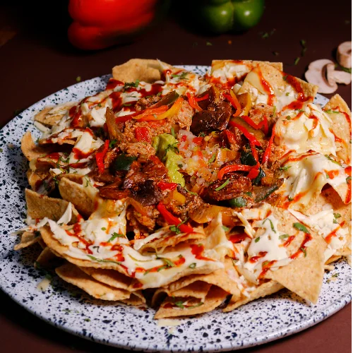 Totopos de maíz crujientes acompañados de champiñones y pimientos salteados, pico de gallo, guacamole casero, queso mozzarella fundido, salsa chipotle ligeramente picante, sour cream y jalapeños ¡perfectos para compartir!.